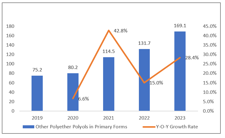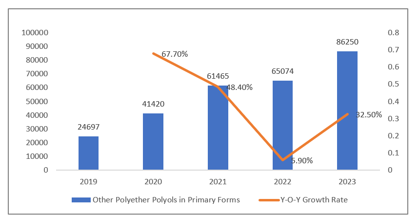 China’s exports of other polyether polyols in primary forms have kept growing at a 22.4% CAGR from 2019 to 2023. HS Code 39072990 includes a variety of products such as polyether polyol monomers, blends, polyethylene glycol, polyphenyl ether, polyether ether ketone, among others. Due to objective conditions, detailed data on export declarations cannot be obtained.