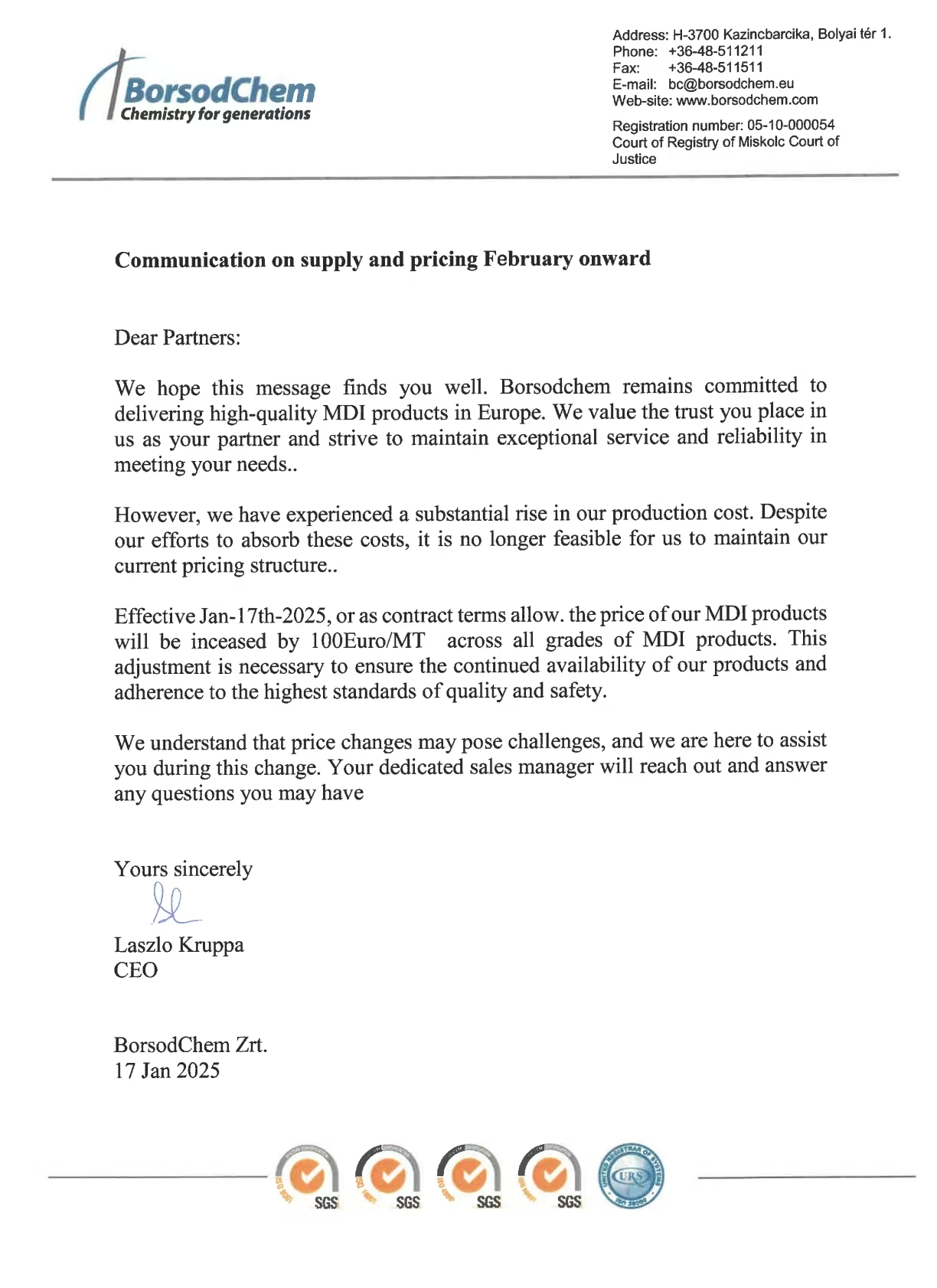 Effective January 17, 2025, or as permitted under the terms of our contracts, the price of all MDI products will increase by EUR 100 per metric ton.