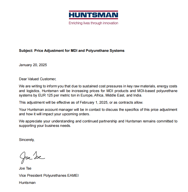Huntsman has announced a price adjustment for MDI products and MDI-based polyurethane systems in Europe, Africa, the Middle East, and India. Prices will increase by EUR 125 per metric ton, effective February 1, 2025, or as per contract terms. This move comes in response to rising costs in raw materials, energy, and logistics.
