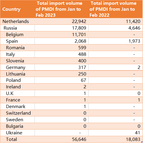 The most important thermal insulation material for refrigerators and freezers is polymeric MDI (PMDI), which is mainly used in the production of polyurethane foam. Polyurethane foam is an excellent insulation material that can maintain a low temperature environment in refrigerators and refrigerators to prevent food and drinks from spoiling. As shown in the table below, European PMDI imports from China reached 56,646 tonnes in January-February 2023, an increase of 213% year-on-year, which was undoubtedly a sharp increase compared to the poor performance in 2022.