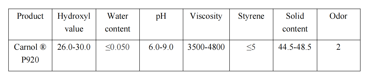 Made from macromonomers with higher molecular weight/functionality and using optimized process, Carnol ® P920 has a narrow particle size distribution, ranging between 0.4 and 4um. thus, it meets this requirement and can support green production of polyurethane sponge.