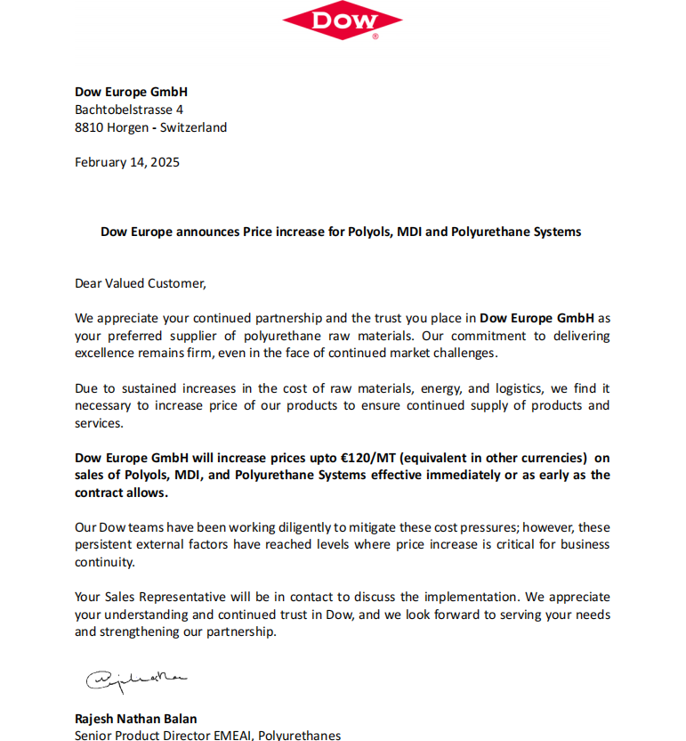 On February 14, 2025, Dow Europe GmbH has announced a price increase of up to €120/MT on Polyols, MDI, and Polyurethane Systems due to rising costs of raw materials, energy, and logistics. Customers will be contacted by their sales representatives for further details.