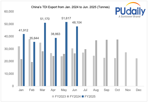 Between January and June 2025, China exported a total of 267,310 tonnes of TDI, marking a significant year-on-year increase of 82.19%. This strong upward trend suggests that total exports for the full year 2025 are likely to achieve substantial growth compared to 2024.