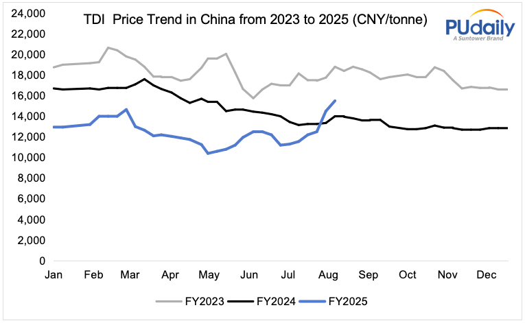In July, the Chinese TDI market demonstrated robust upward momentum, with prices widening significantly. At the month's outset, the market extended late June's weak volatility, marked by subdued demand, sluggish new orders, and persistent sales pressure on traders, sustaining low price levels.