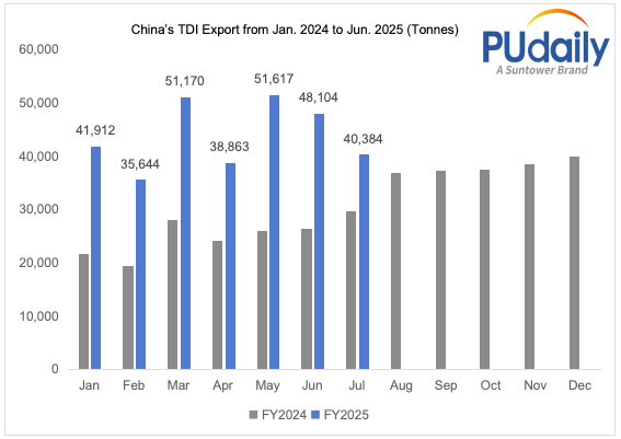 China exported 40,384 tonnes of TDI in July 2025, a 16.05% decline MoM but a 35.60% increase YoY.
